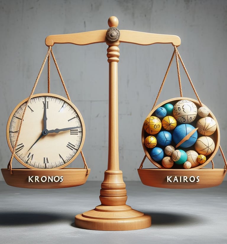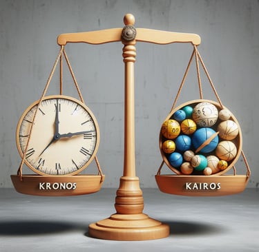 Terapi odasında kronos ve kairos arasında denge kurmak, terapinin planlı bir süreç içinde ilerlemesini sağlayan kronosun yanı sıra, terapinin yaratıcı ve anlam dolu olmasını sağlayan kairosun dengeli bir şekilde bir araya gelmesini gerektirir. Kronos, terapinin belirli bir süre, sıklık ve düzen içinde yürütülmesini sağlayarak terapiye bağlılığı, güvenliği ve sürekliliği artırırken, aynı zamanda terapinin hedeflerini, ilerlemesini ve sonlanmasını da belirler. Kairos ise terapinin esnekliğini, yaratıcılığını ve anlamlılığını vurgular. Terapistin ve danışanın an'a odaklanmasına, fırsatları değerlendirmesine ve yeni bakış açıları geliştirmesine olanak tanır. Bu da terapinin canlılığını, derinliğini ve dönüştürücü gücünü artırır.